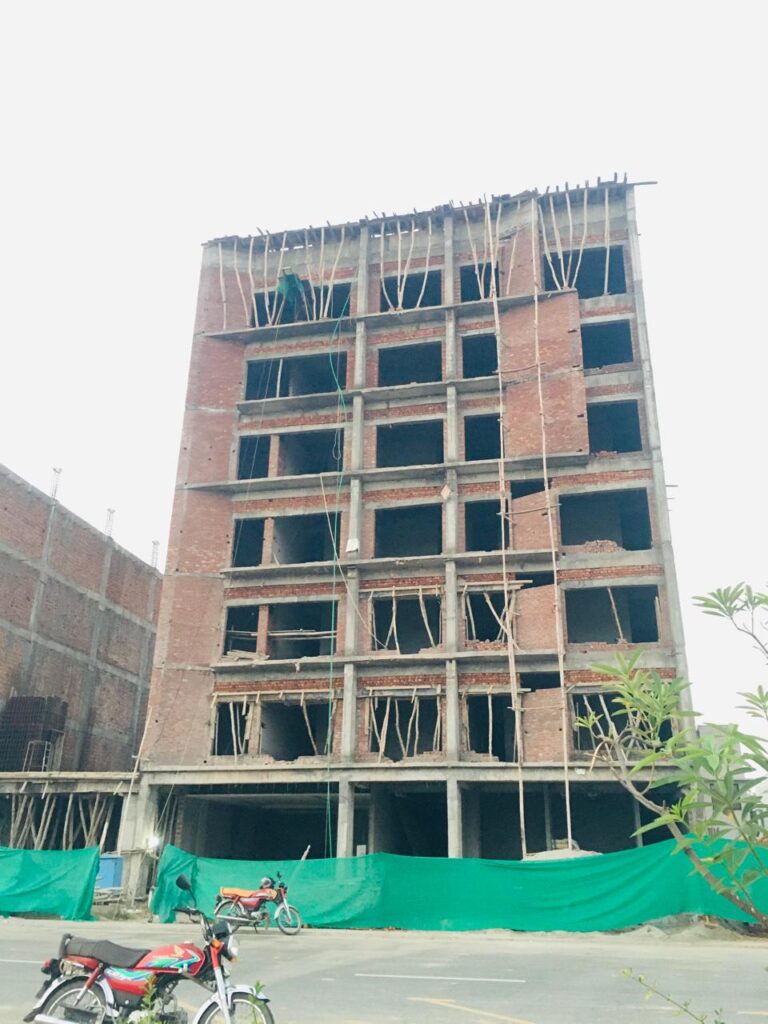 4-storey commercial building under active grey structure construction. Brick and RCC frame work in progress with full project management.