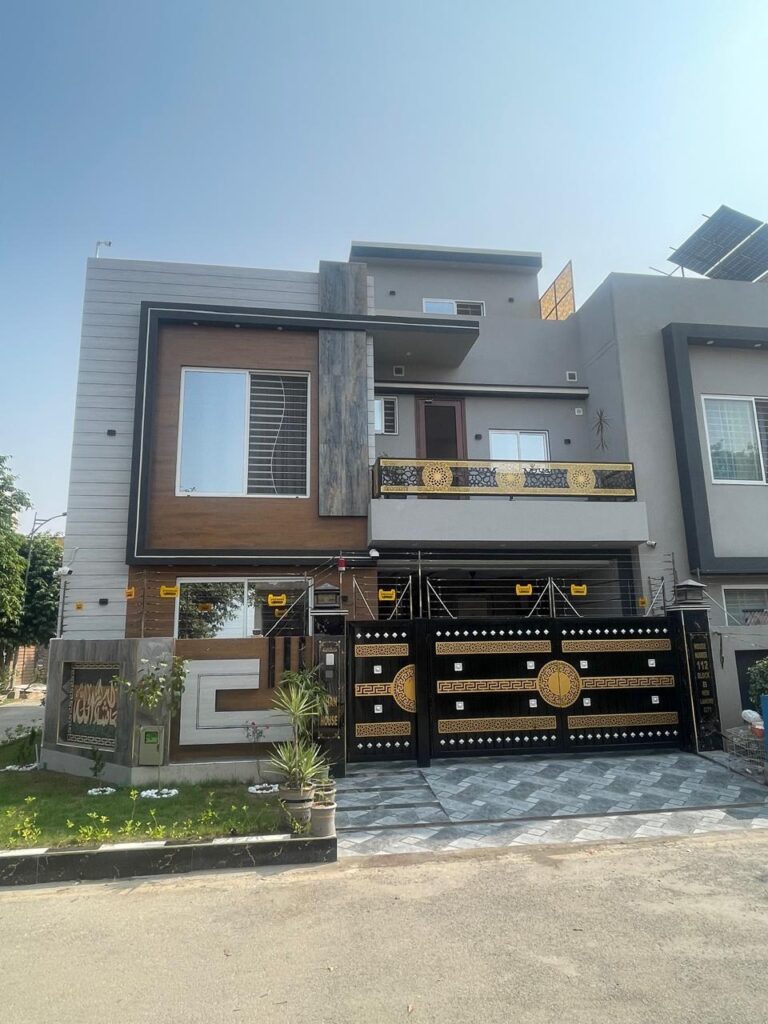 Turnkey 5 Marla house with premium exterior finishing, wood cladding, and gold ornamental gate.